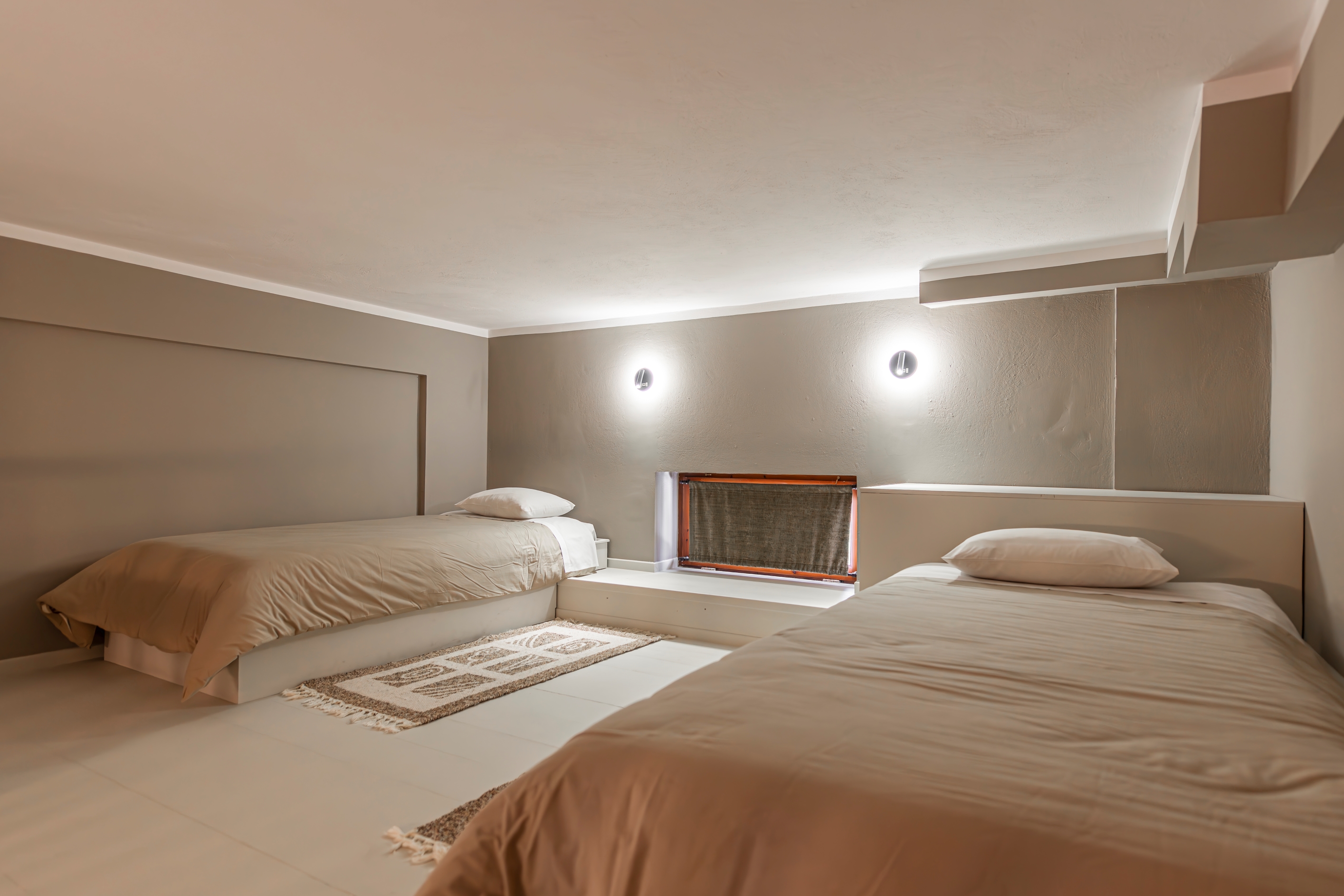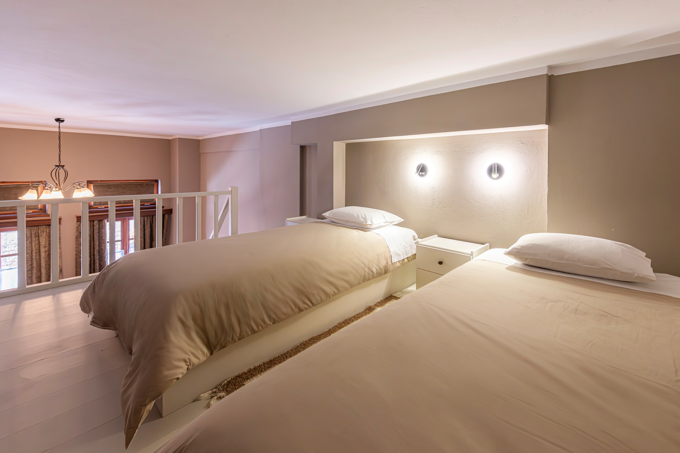 The main level features a spacious open-plan layout with a plush double bed and a sitting area with a fireplace. The upper loft includes two extra single beds in a peaceful nook, ideal for children.